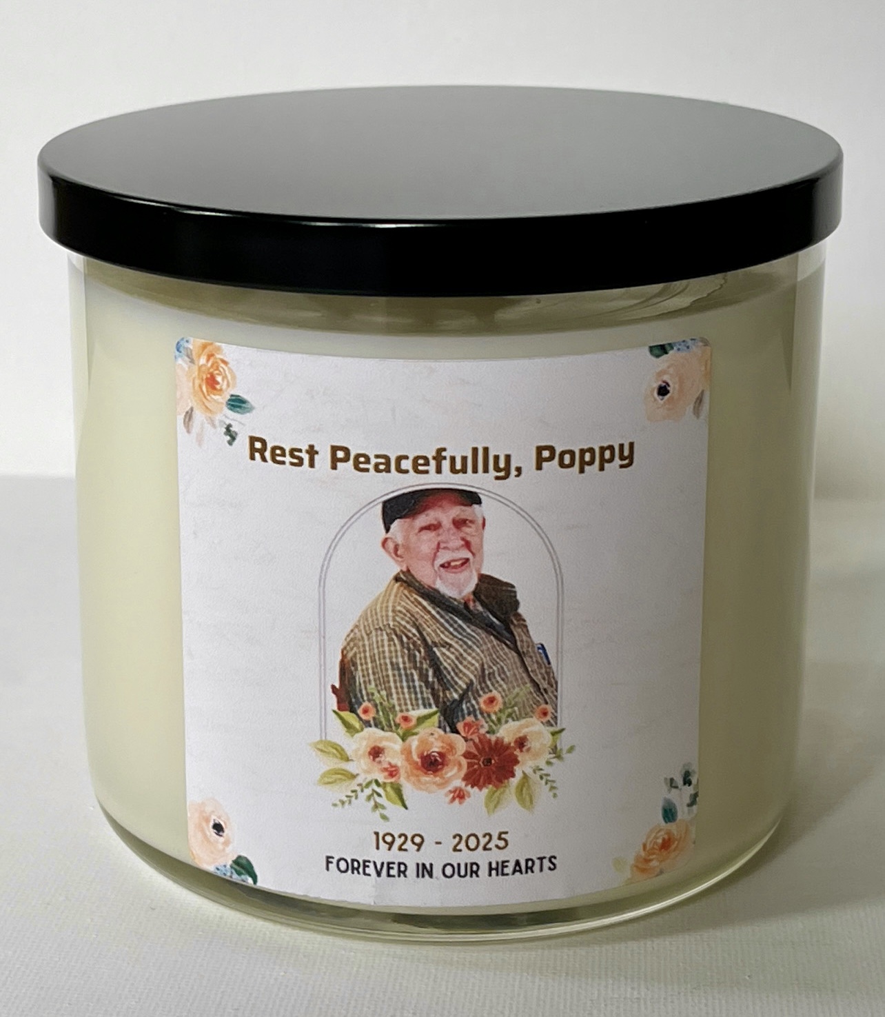 Let them know you’re thinking of them with our 18oz soy wax Memorial candle scented in rose petals. Each candle is personalized for the lost loved one.